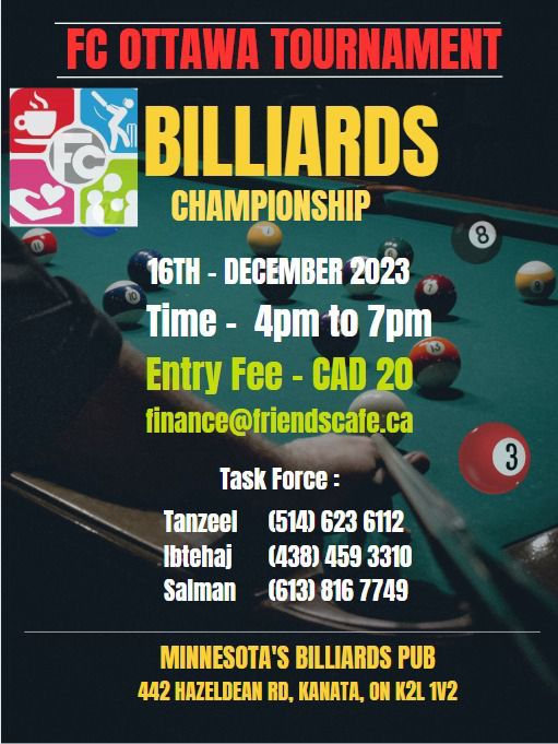 fcafeu February 26, 2024 0 comments FC Billiard Tournament Ottawa FC Billiard Tournament Ottawa by Friends Cafe Club of Canada 894 894 people viewed this event. Event registration closed. Date And Time 2023-12-16 @ 11:00 AM to 2023-12-16 @ 07:00 PM Registration End Date 2023-12-14 Location - Event Types Professional Events Share With Friends Facebook Twitter Linkedin Xing Pinterest