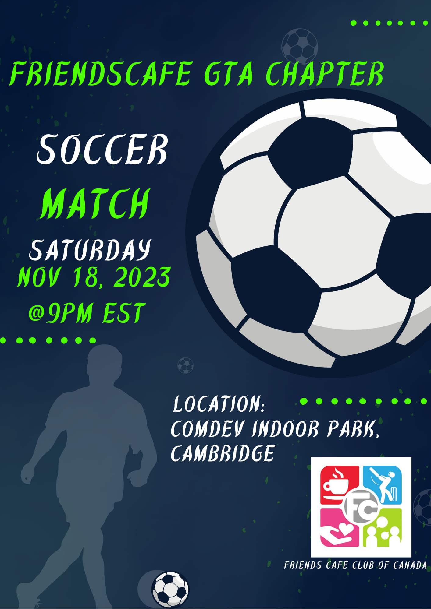 fcafeu February 26, 2024 0 comments Recurring Soccer GTA Recurring Soccer GTA by Friends Cafe Club of Canada 884 884 people viewed this event. Event registration closed. Date And Time 2023-10-12 @ 11:00 AM to 2023-10-12 @ 04:00 PM Registration End Date 2023-10-10 Location - Event Types Recreational Events Share With Friends Facebook Twitter Linkedin Xing Pinterest